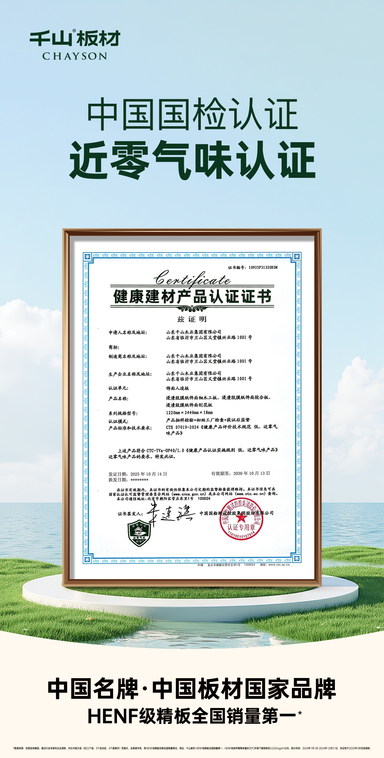 与此同时,千山板材核心产品凭借出色的环保性能与近乎零气味的表现,成功荣获由中国国检集团颁发的近零气味健康建材产品认证证书。这一认证充分彰显了千山板材在降低 TVOC 等污染物、攻克室内异味难题方面的深厚技术实力。