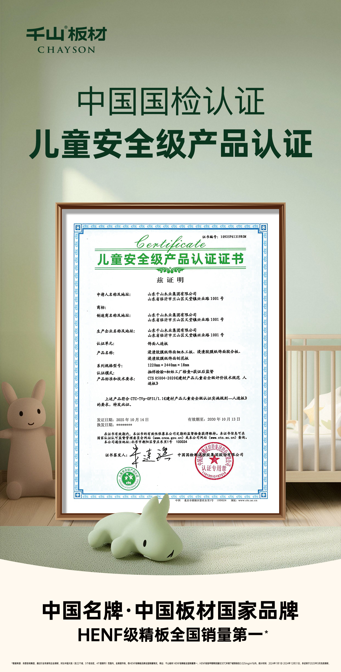 特别在孩子成长的世界里,每一寸空间的质量、每一息空气的安全,都牵动着父母的心。而千山板材凭借卓越的环保标准和安全性能,荣获“儿童安全级认证”和“健康建材产品认证证书”双项权威认可,为儿童家居环境筑起一道坚实防线。