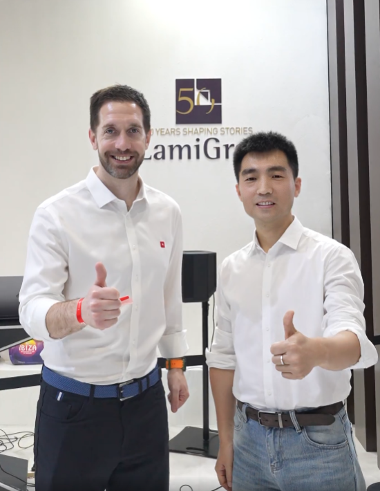 如果说德国工艺赋予千山板材以“骨血”,那么欧洲设计则为其注入了“灵魂”。在西班牙拉米展位,王总与拉米负责人进行深入交流。